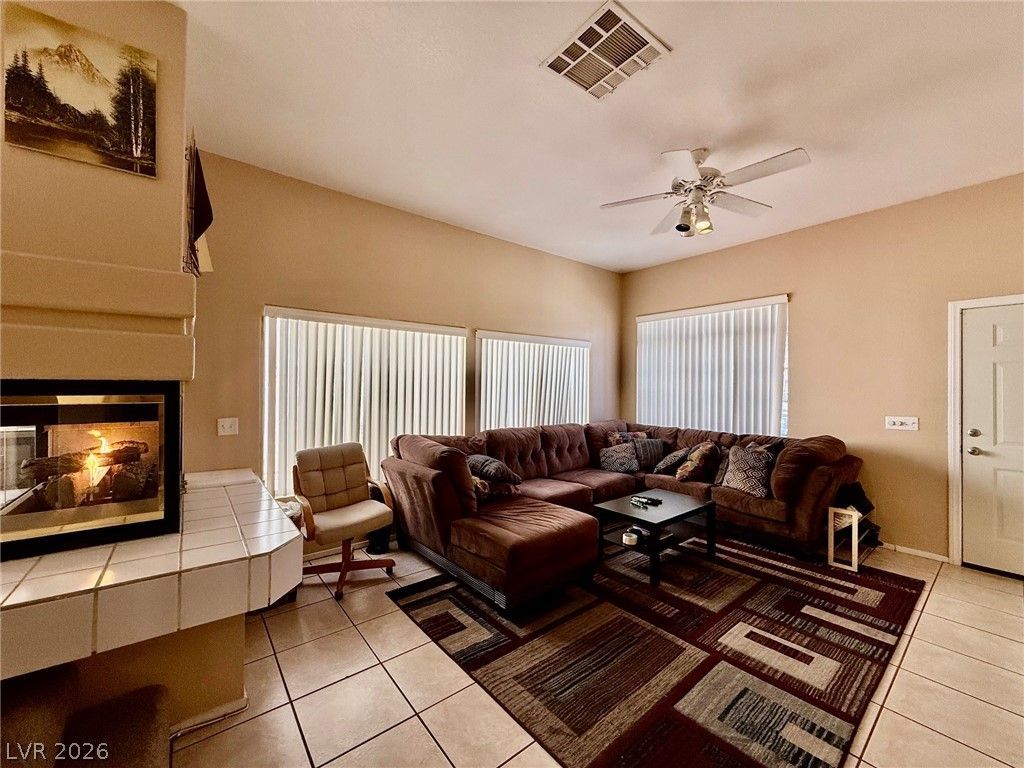 The perfect home in the perfect location. Home features sunken living room with 3-way fireplace, cozy family room with dining area. Kitchen features open concept with lots of counter space and cabinetry. Yard is cozy with patio cover. Upstairs boasts 3 spacious bedrooms. Primary bedroom is generously spaced with separate shower and bath. Community offers clubhouse, pool, and RV parking available. Located in Lone Mountain area, conveniently close to everything!